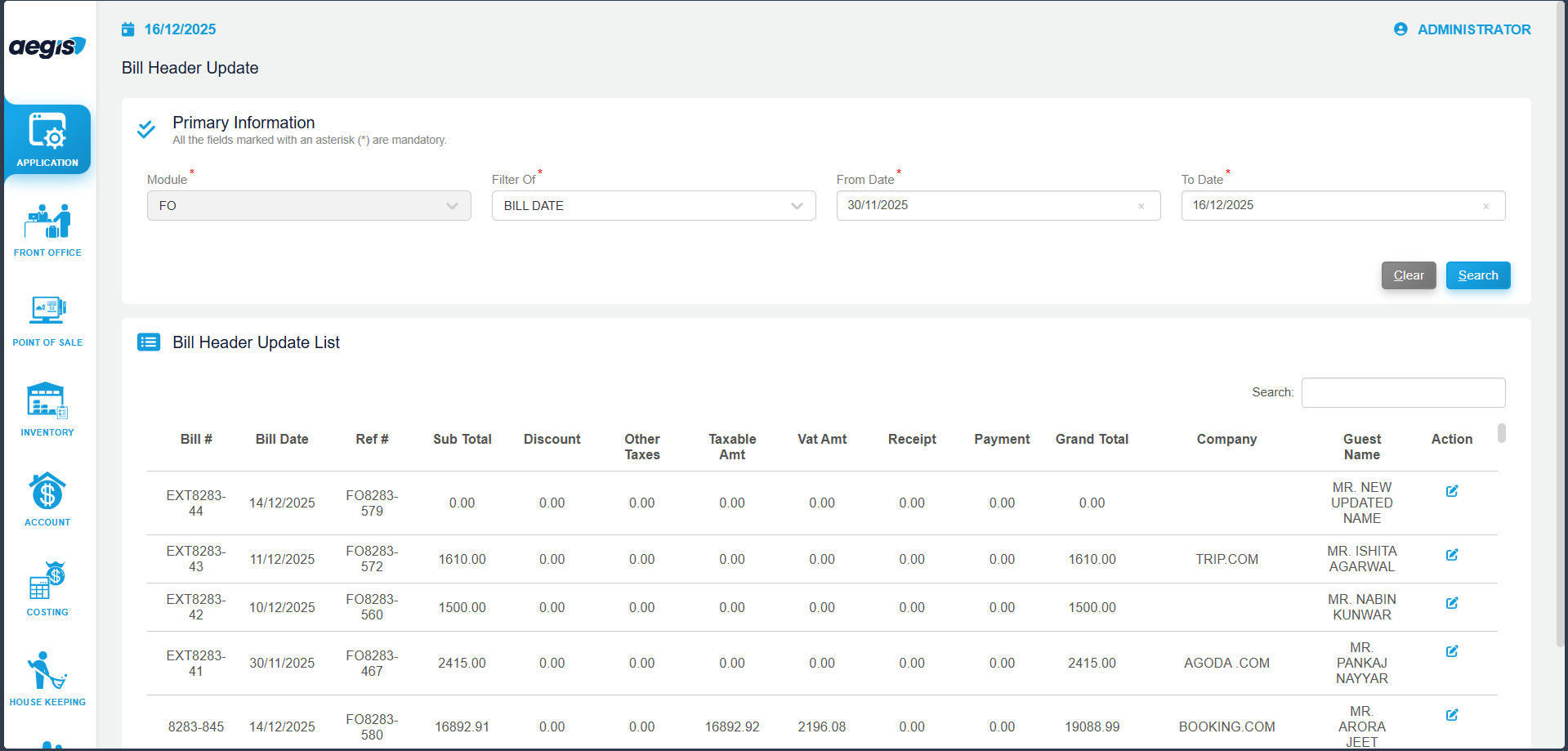 Click on the Bill Header Update icon to open the module.