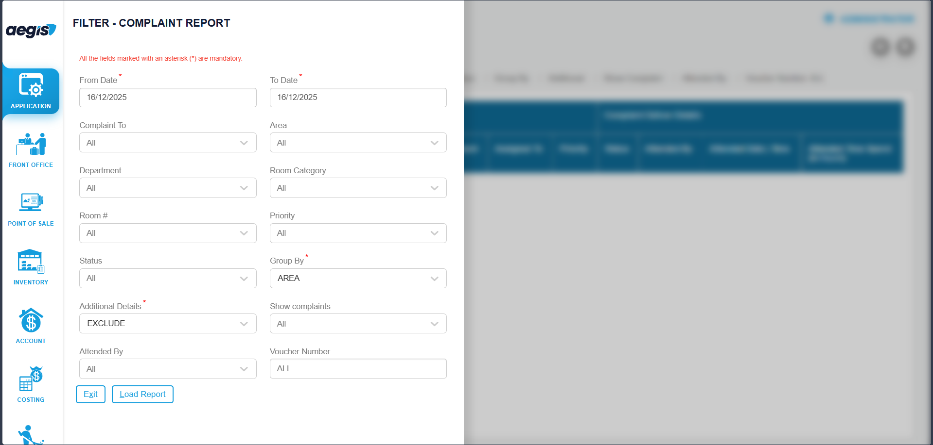 The Complaint Report in Aegis Software allows users to view and track complaints submitted within the system. It helps management monitor complaint status, types, and resolution progress.