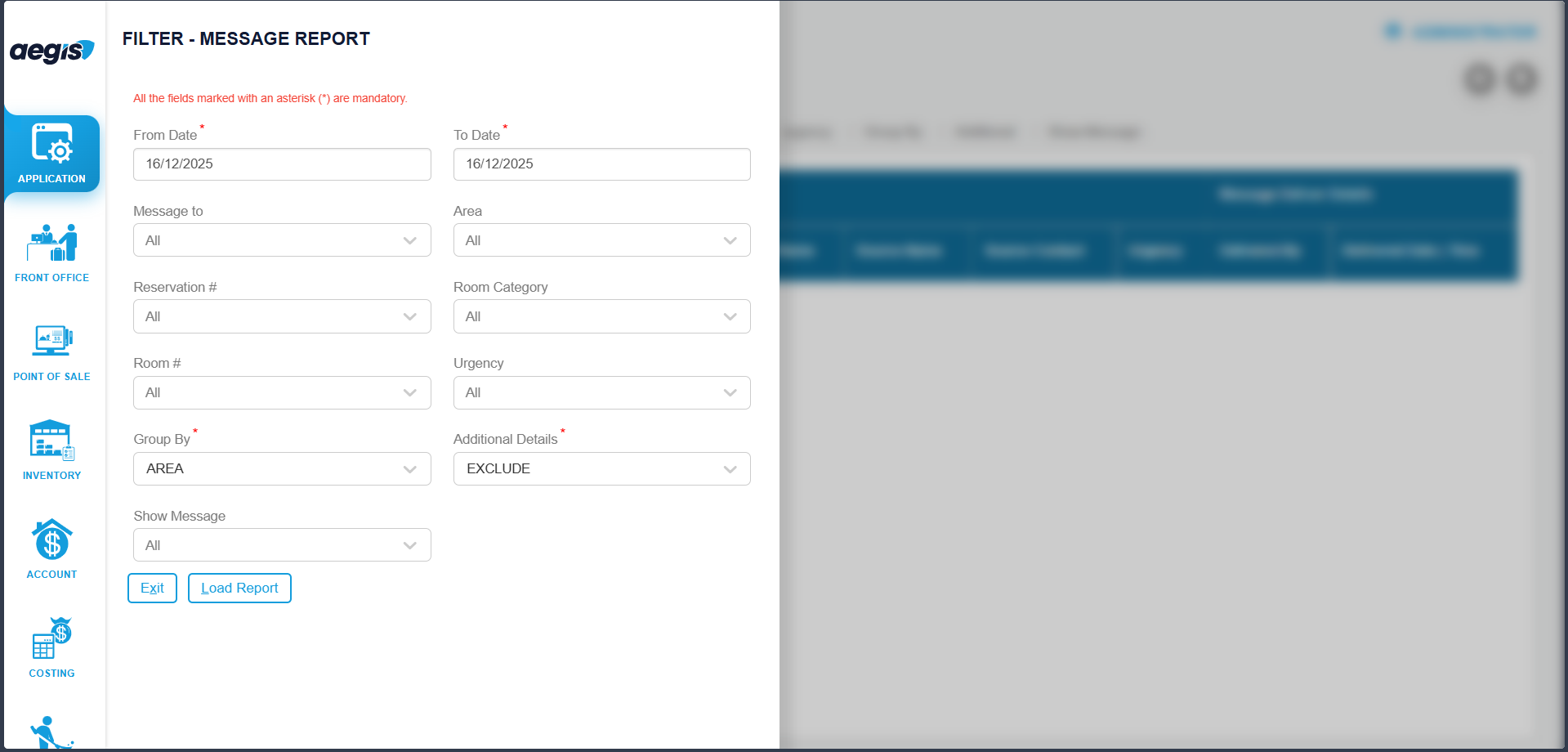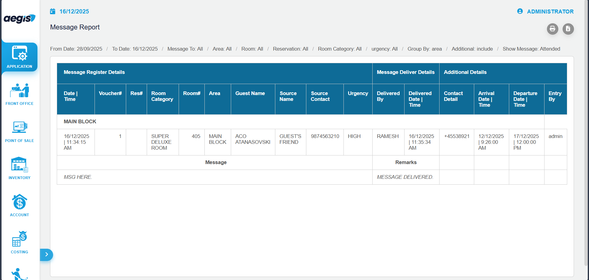 The Message Report in Aegis PMS provides a centralized, read-only view of all system messages. This screen is primarily used to monitor and track messages, ensuring important communications are acknowledged and properly attended.
