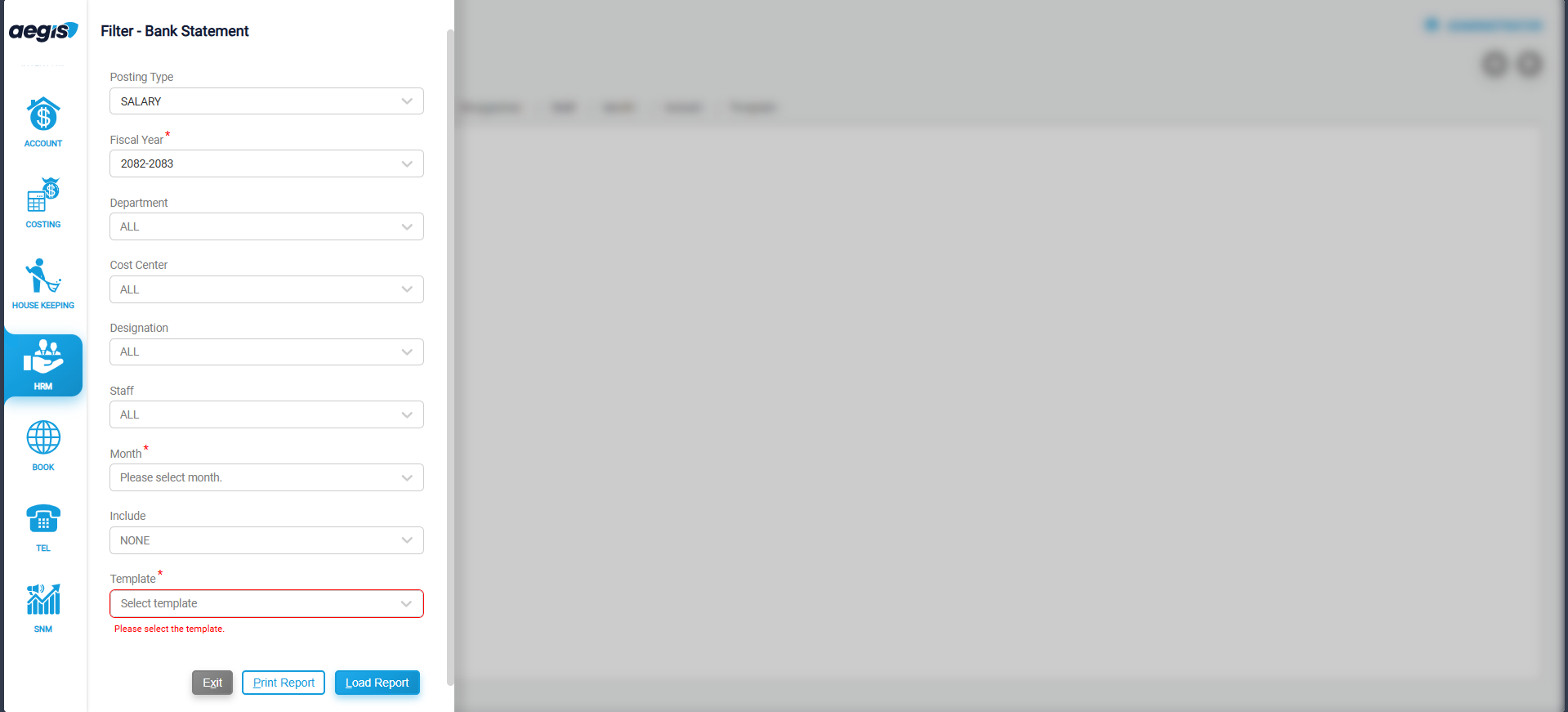 The Bank Statement Report in Aegis PMS allows administrators to generate official bank letters for salary disbursement. This report streamlines the process of salary transfer by creating a structured, printable document that can be submitted to banks.