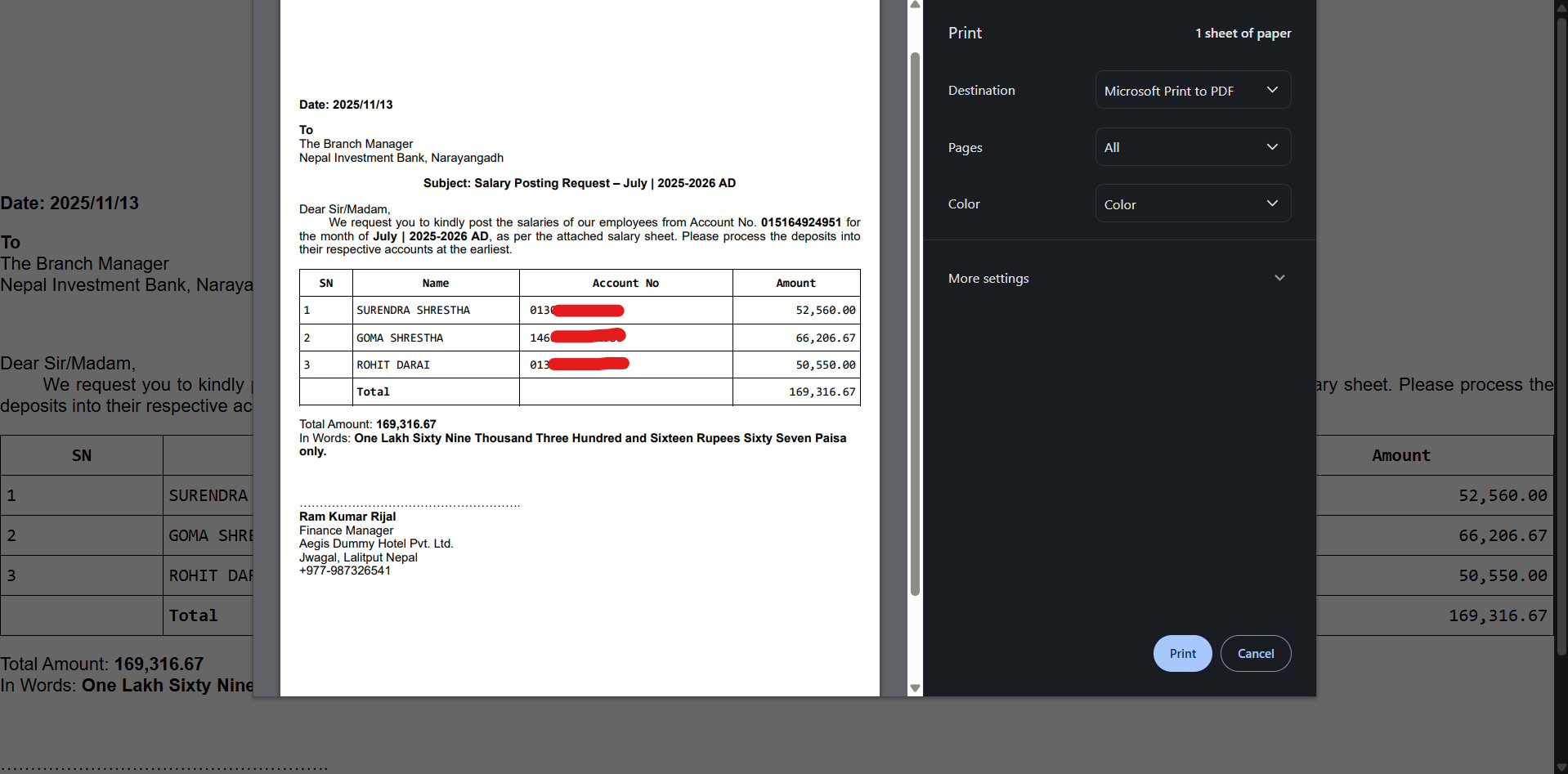 Tip: Use this report to prepare official bank letters for salary transfer efficiently and ensure accuracy in payment distribution.