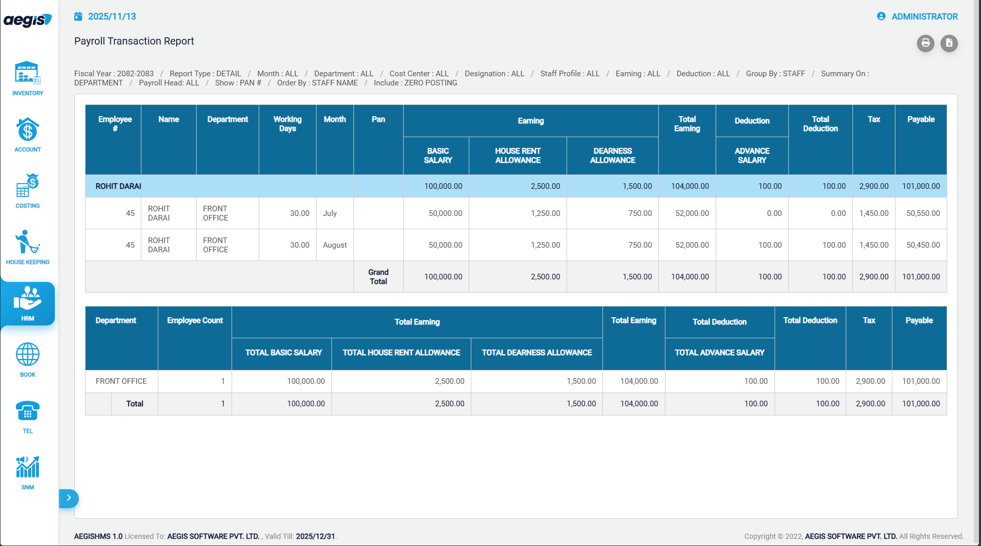 - Summary Totals: Displays total amounts for all selected payroll heads.