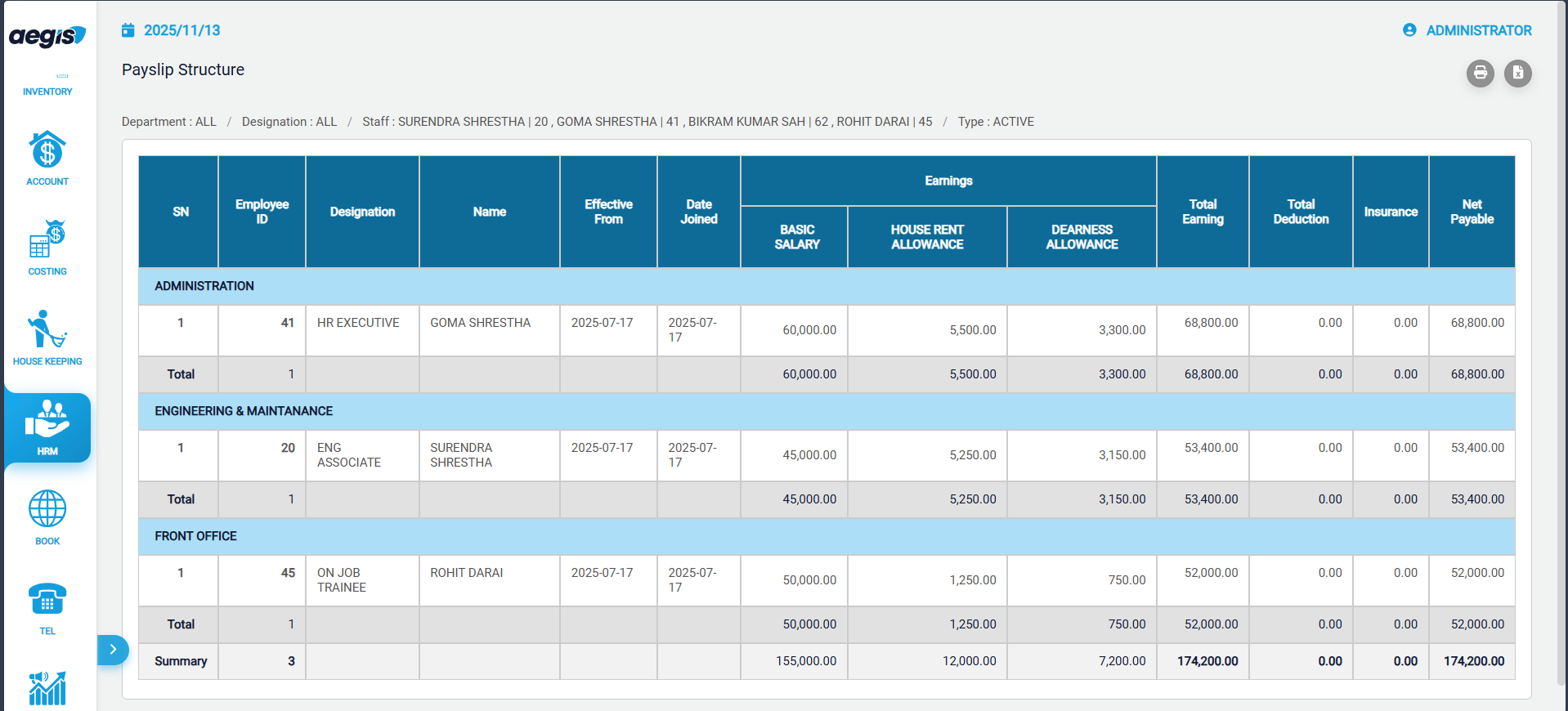 The Payslip Structure Report in Aegis PMS provides a detailed overview of the salary configuration for each staff member. This report allows HR and payroll administrators to verify all addition and deduction heads, confirm attendance-related calculations, and review upcoming salary increments.