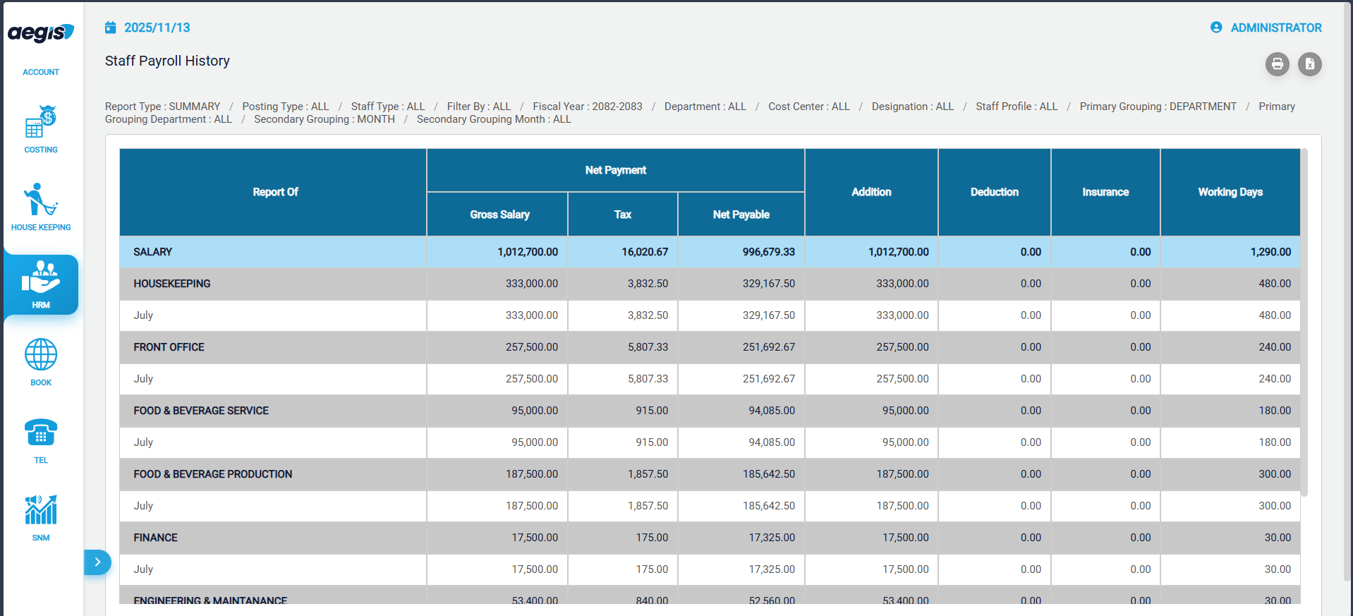 The Staff Payroll History Report in Aegis PMS provides a complete record of all posted salary transactions. This report helps HR and payroll administrators review past payroll data, monitor salary distributions, and generate department-wise or staff-wise summaries for reporting and audit purposes.