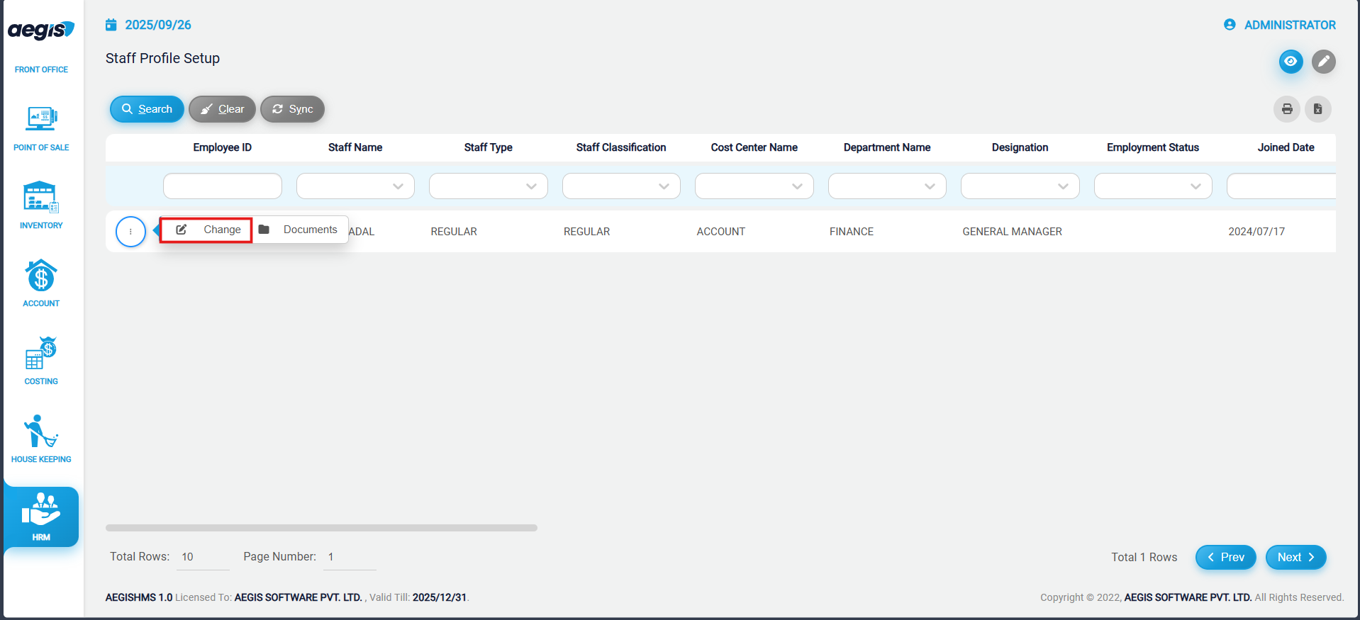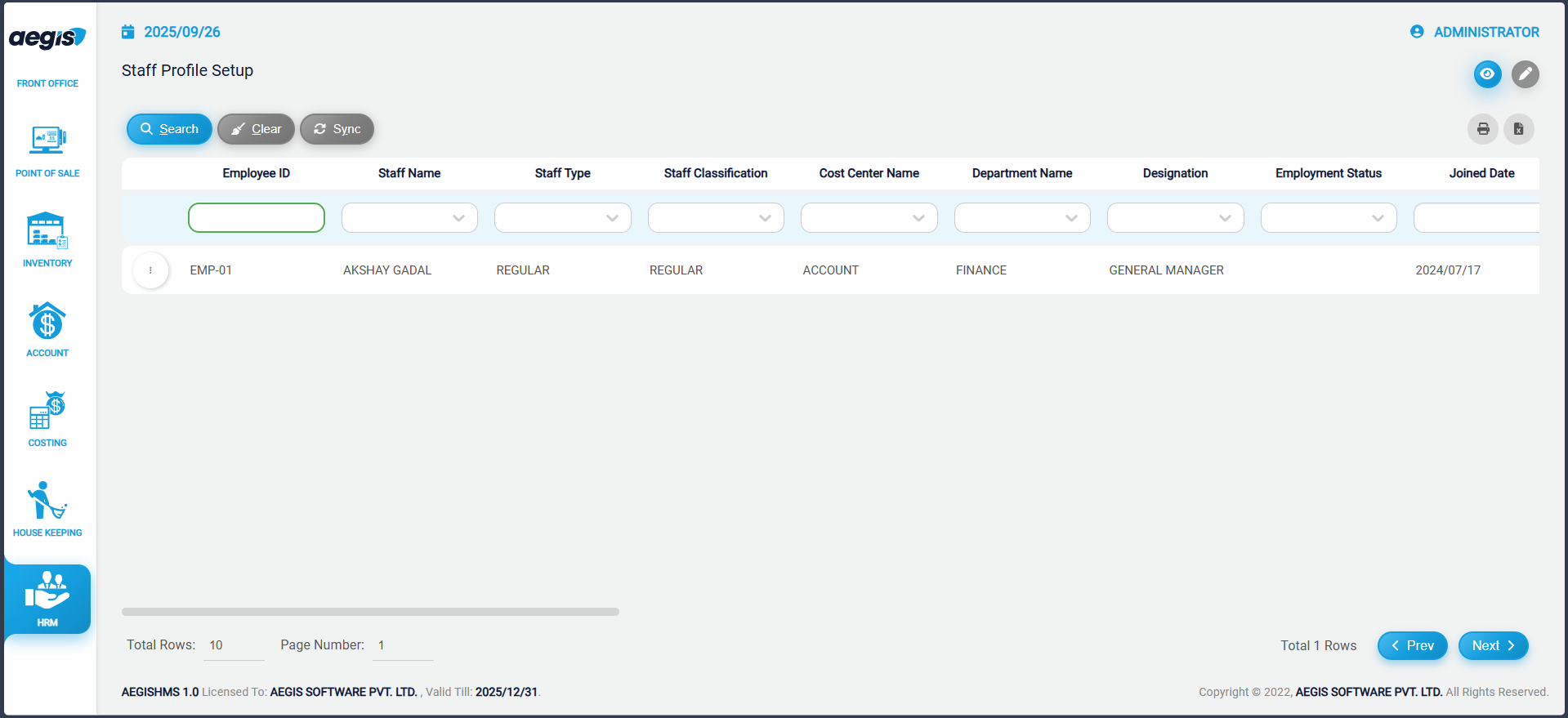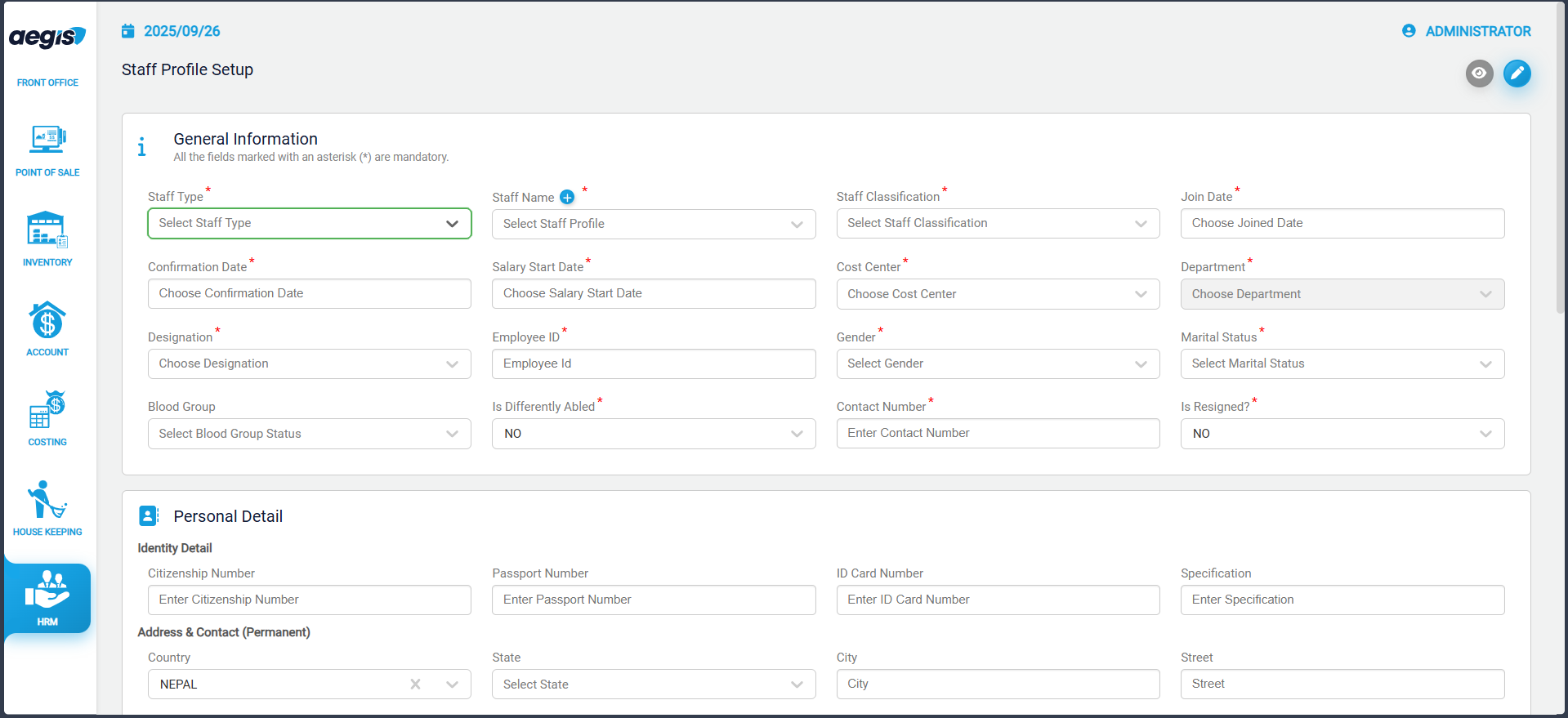 The Staff Profile module in Aegis PMS allows you to create and manage employee information required for payroll and HR-related processes. Each staff profile stores essential details such as personal information, department, designation, and employment data used throughout the HRM module.