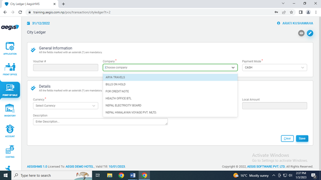 Go to POS>>Transaction>>city ledger